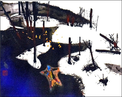 ■写真右:真冬の冷え込む夕方、会場に置かれた石油ストーブを囲む