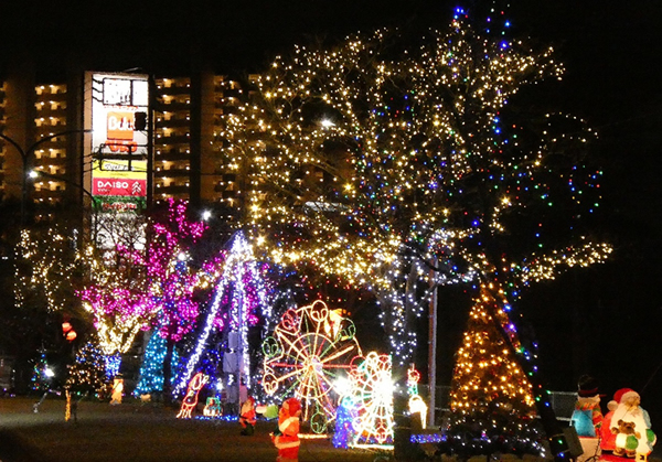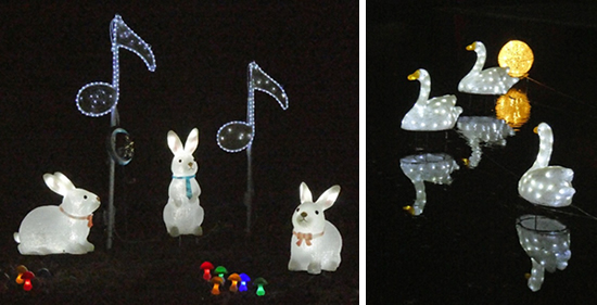 住宅街にある道路の植え込みに電飾が巻き付けられ、街路灯や看板灯とともに年の瀬の寒空を彩った。公園のアーケードや園路の木々の飾りつけ、小動物のあしらいも楽しい。