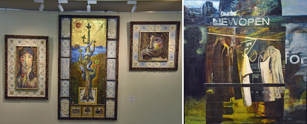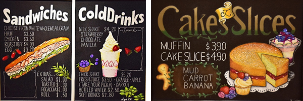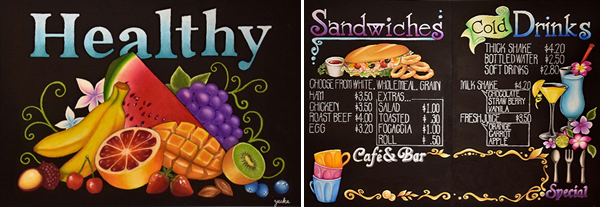 ウエルカム看板やメニュー表にとどまらず、イラスト風から絵画風など、個性的な作品が所せましと展示された。