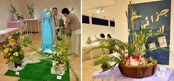 単に花を飾るだけでなく、空間を彩るアートとしての面もあり、社交ダンスの衣装と2作品とのコラボコーナーもあった。