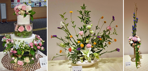 ヨーロピアンフラワーアレンジメントの「夢花会」(主宰者・卯月彩花〈本名・啓子〉さん)会員による作品展。100を超える作品が出品され、生花の香りと際立つ色合いが入場者を魅了した。