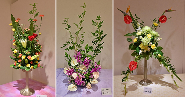 花材、花器は自由で剣山の代わりに水をたっぷり含ませたスポンジに花を刺す。扇状もあれば縦長、横長、円錐などとサイズも形状も様々に活ける。