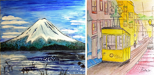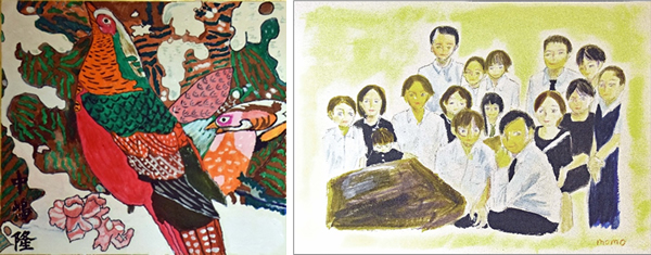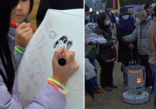 ■写真左:ランタンに「けんこう」「平和」などの想いを書き込む参加者