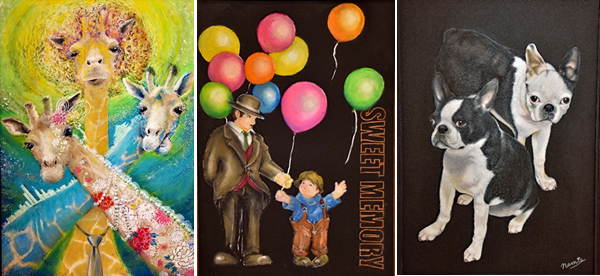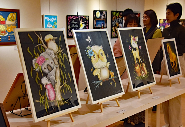 ウエルカム看板やメニュー表にとどまらず、イラスト風から絵画風など、個性的な作品が所せましと展示された。