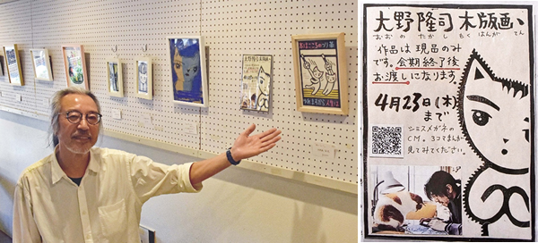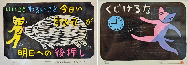 ――耳がキリっと立って眉と目が人のように描かれて愛らしいネコに駄洒落のメッセージが利く木版画家大野隆司さんの作品。そんな「大野ネコ画」展が柏市大津ヶ丘のカフェ「クルトコ」、同市花野井にあるお寺「大洞院」のギャラリーで開かれている。